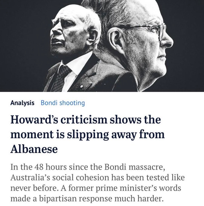 The politicisation of national disasters has been there for some time. One side looks to corner the other using political wedges; Labor criticised Morrison in Hawaii for claiming not to hold hoses, the coalition blasted Albanese for his response to NSW floods—and the media has joined in to politically repackage every disaster into a political object that can be used to inflict blunt force. Seemingly gone are the bipartisan calls for calm and pragmatism that we saw during Port Arthur; instead we see John Howard, Prime Minister responsible for the response to Australia’s worst-ever shooting event, taking a steaming dump onto Anthony Albanese, the Prime Minister today who oversees the response to the worst act of political violence in Australian history.
