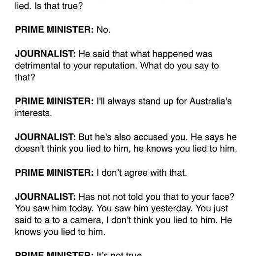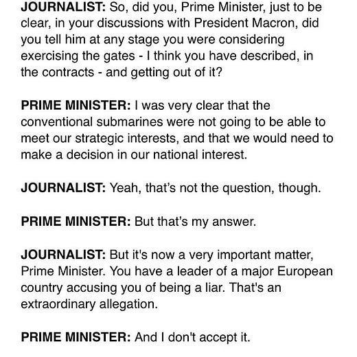 President Emmanuel Macron, a highly-practiced and powerful European politician from a country that has more television philosophers than we have former footy player betting app shills, says “I have a lot of respect for your country” for “your people” before he answers “I don’t think, I know” to a question about the Prime Minister lying to him. The fact that the leader of a key sovereign nation-state and international power calls our leader a liar at an international forum demonstrates the seriousness of the delicate situation and its bearing on our international standing.
