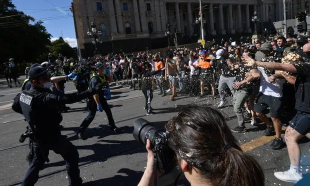 Three weeks after Sky News Australia was banned for COVID misinformation, the tension broke the banks of the Melbourne lockdown and spilled out onto its streets. A loose grouping of protesters, the product of nightmare algorithmic auto-play selections, descended into Melbourne to protest against the sixth lockdown of this era of pandemic and disappointment. The finite measures of control ceded to the futility of Delta in the streets on Saturday. It seemed more evident that emotions around this crisis had evolved into desperation, bitterness and rage, culminating in a heightened level of violence not seen in twenty years.