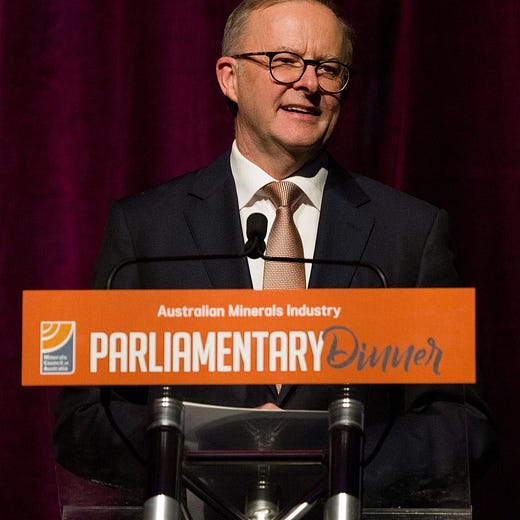 A few days later, at a dinner hosted by the Minerals Council of Australia, the largest and most powerful mining lobby group in the country, Anthony Albanese reassured mining and energy bosses that he wanted to “unlock more value from our minerals”. Then, only a week after the exciting Business Council of Australia dinner, but just the day after the mid-winter ball (sponsored by Woodside), Labor sat alongside the LNP in the major party blob formation. Voting together, perhaps gaggling about the hangover from the night before, they voted together to support further coal and gas projects. Another 114 to be exact!