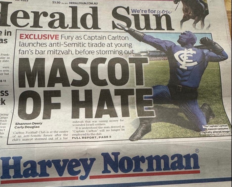 ‘Mascot of Hate’ was the front pager of the Herald Sun the next day, who just went ‘bang with the football’— making it national news—claiming that the mascot performer launched an ‘antisemitic tirade’ before ‘storming out’. These allegations were put forward by senior club members and Jewish community figures, that were present among high profile Zionists like co-chair of the Australia/Israel & Jewish Affairs Council (AIJAC) Jeremy Leibler, claiming the Mascot left the event shouting “I’m not doing this for f******* Zios (Zionists).” Carlton issued a rapid response, releasing a statement informing the public that the mascot performer was immediately sacked.